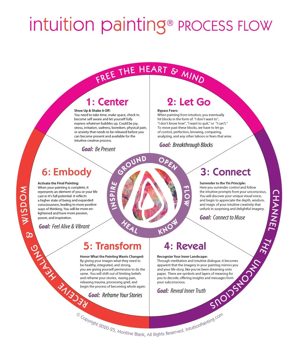 Born from the expressive arts movement, informed by the visionary work of Aviva Gold, Shaun McNiff, Natalie Rogers, Michelle Cassou, Stewart Cubley, and others—and brought to life in its current form by Montine Blank, Intuition Painting® is a six-phase, non-directive painting process that blends intuitive creative expression with art-based coaching for creative freedom and personal revelation.